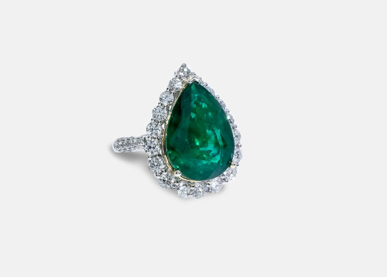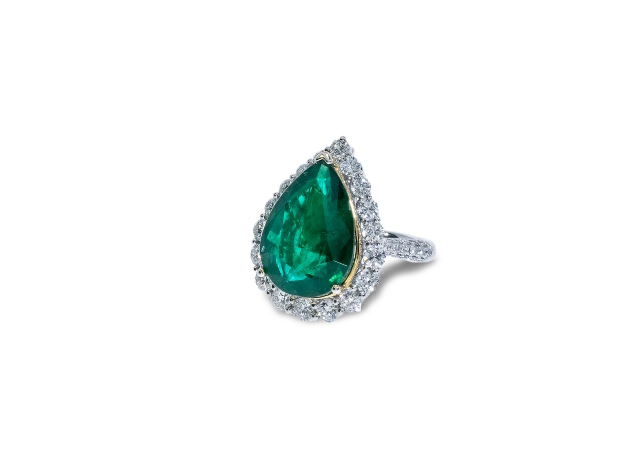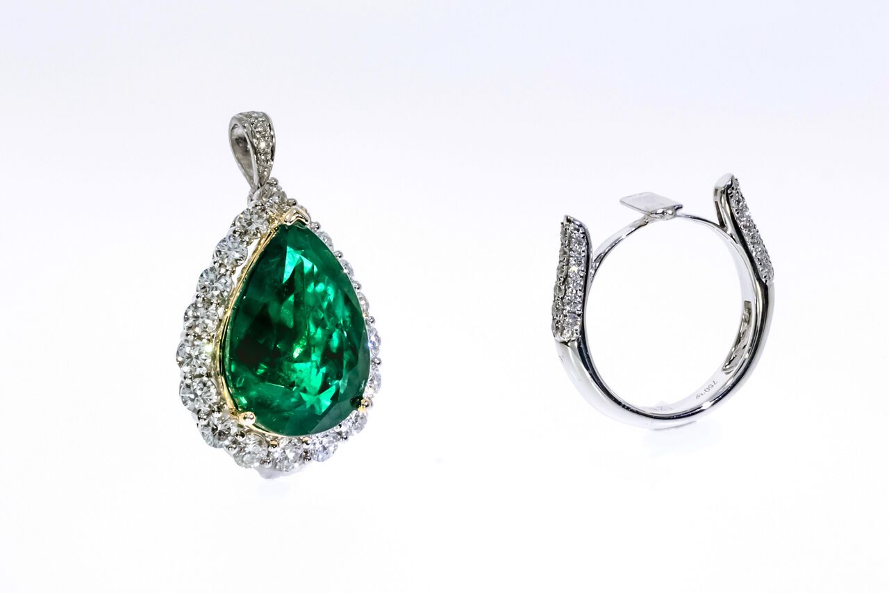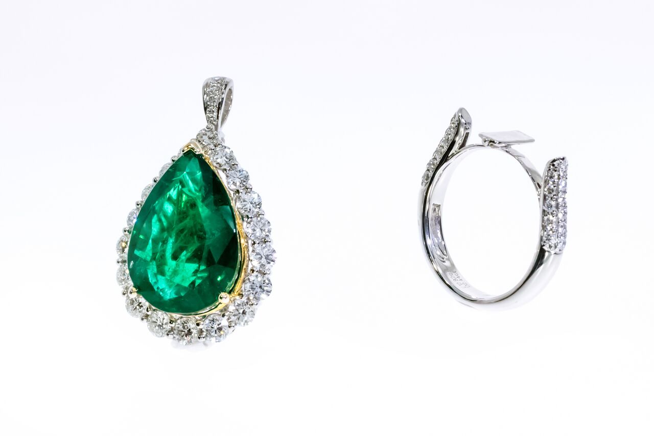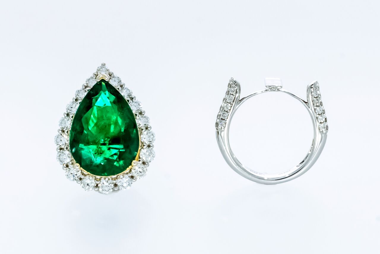 18K黃鉑金梨形綠寶圓石鑽石戒指鍊墜兩用