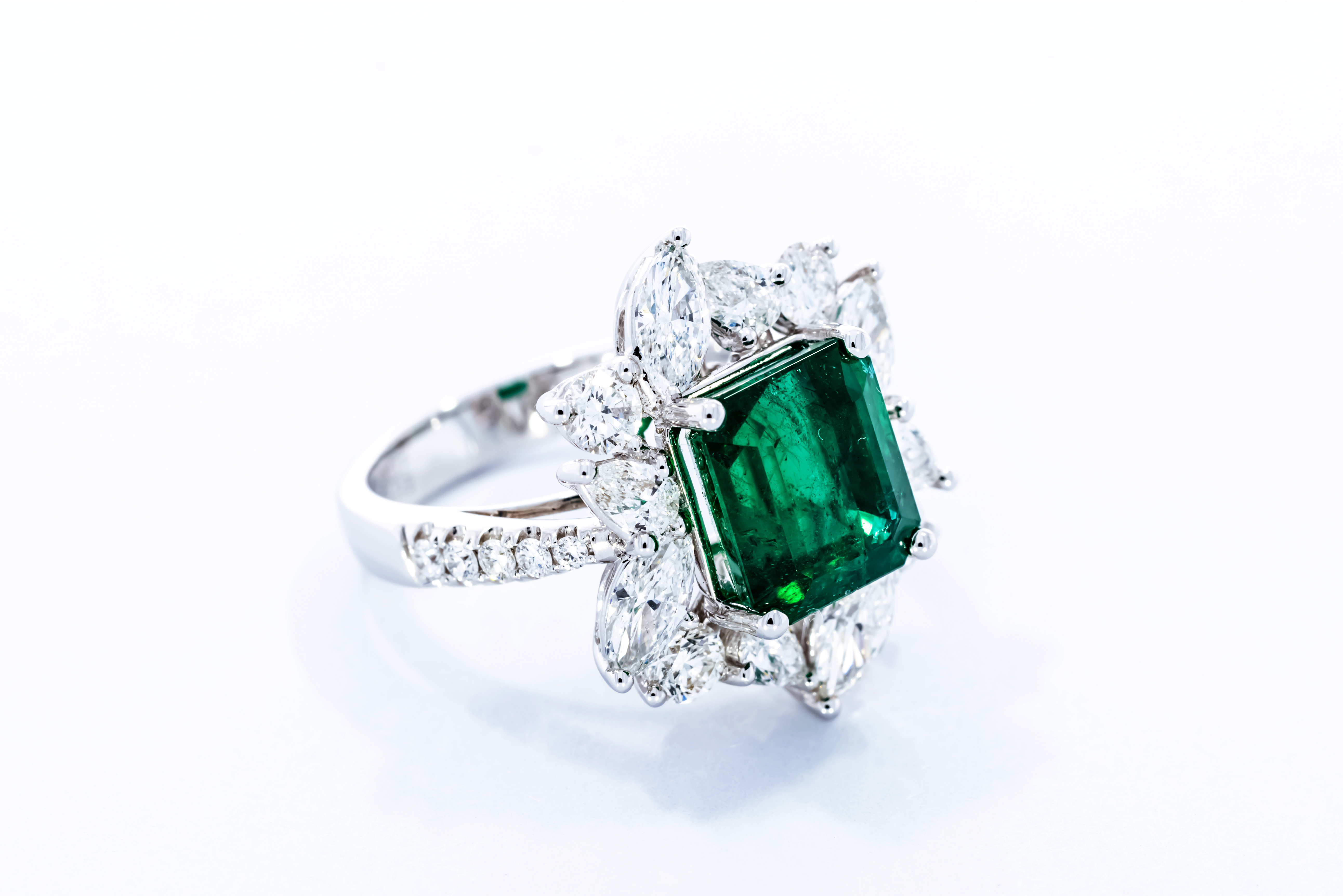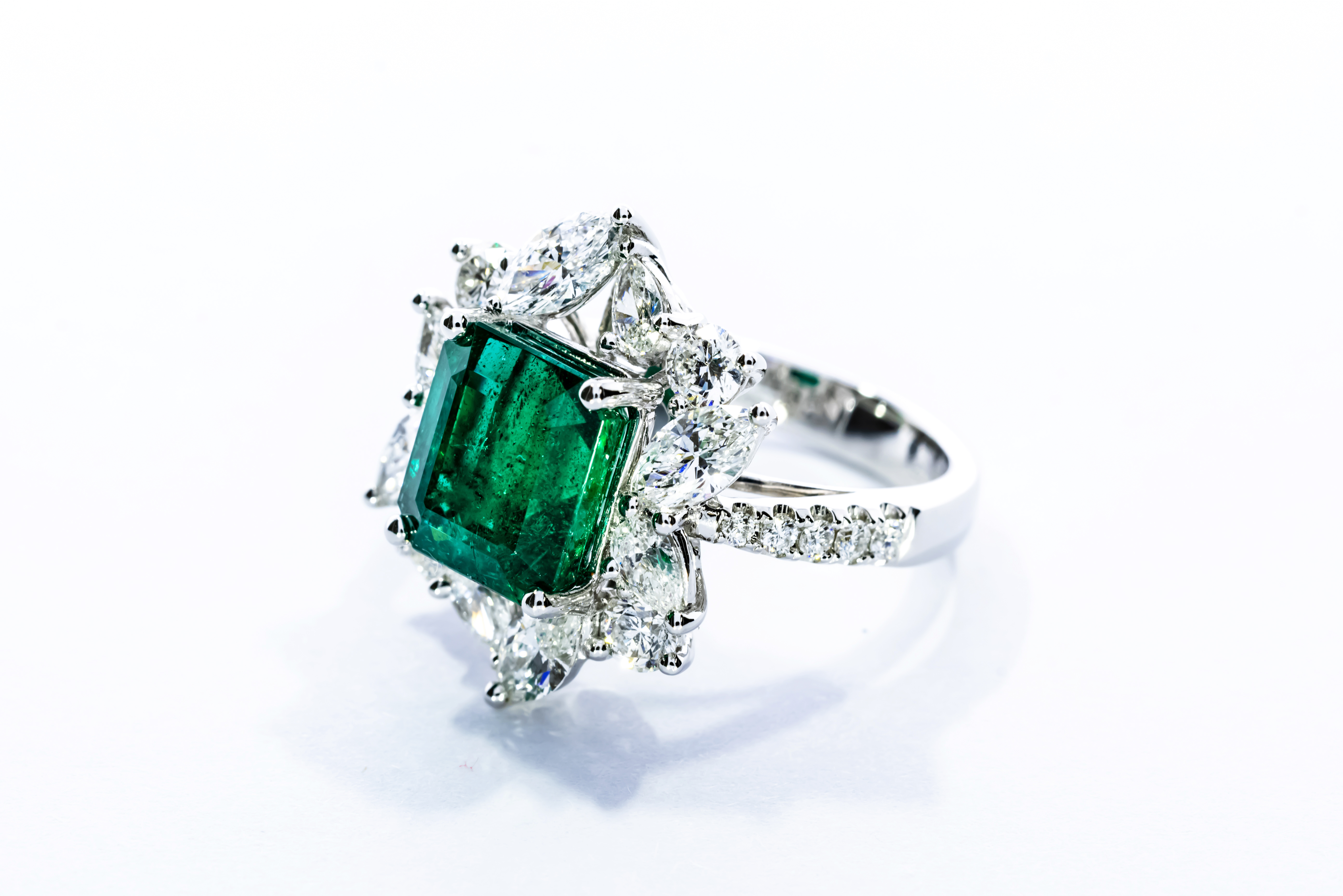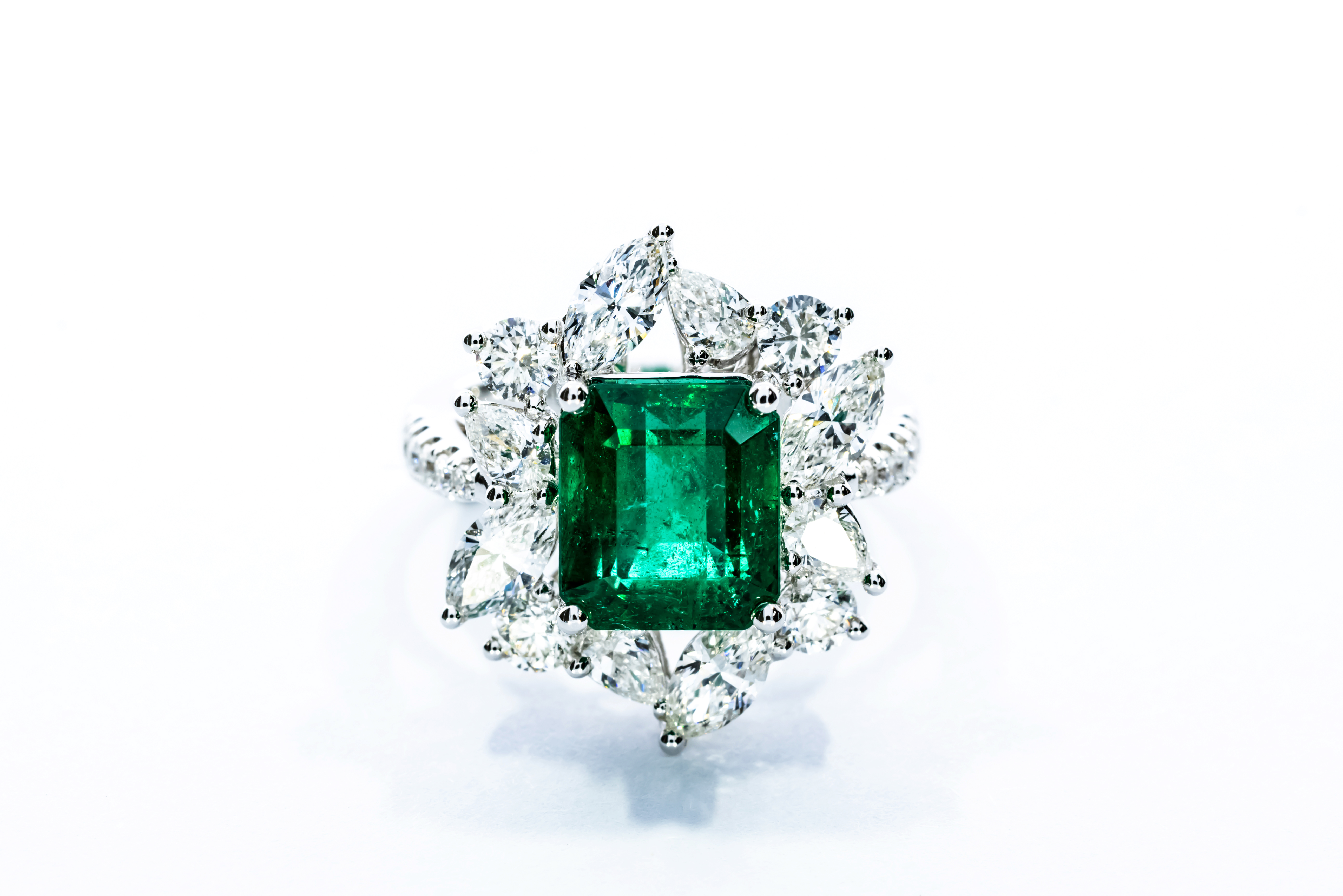 18K铂金方欖尖綠寶石梨形鑽石戒指